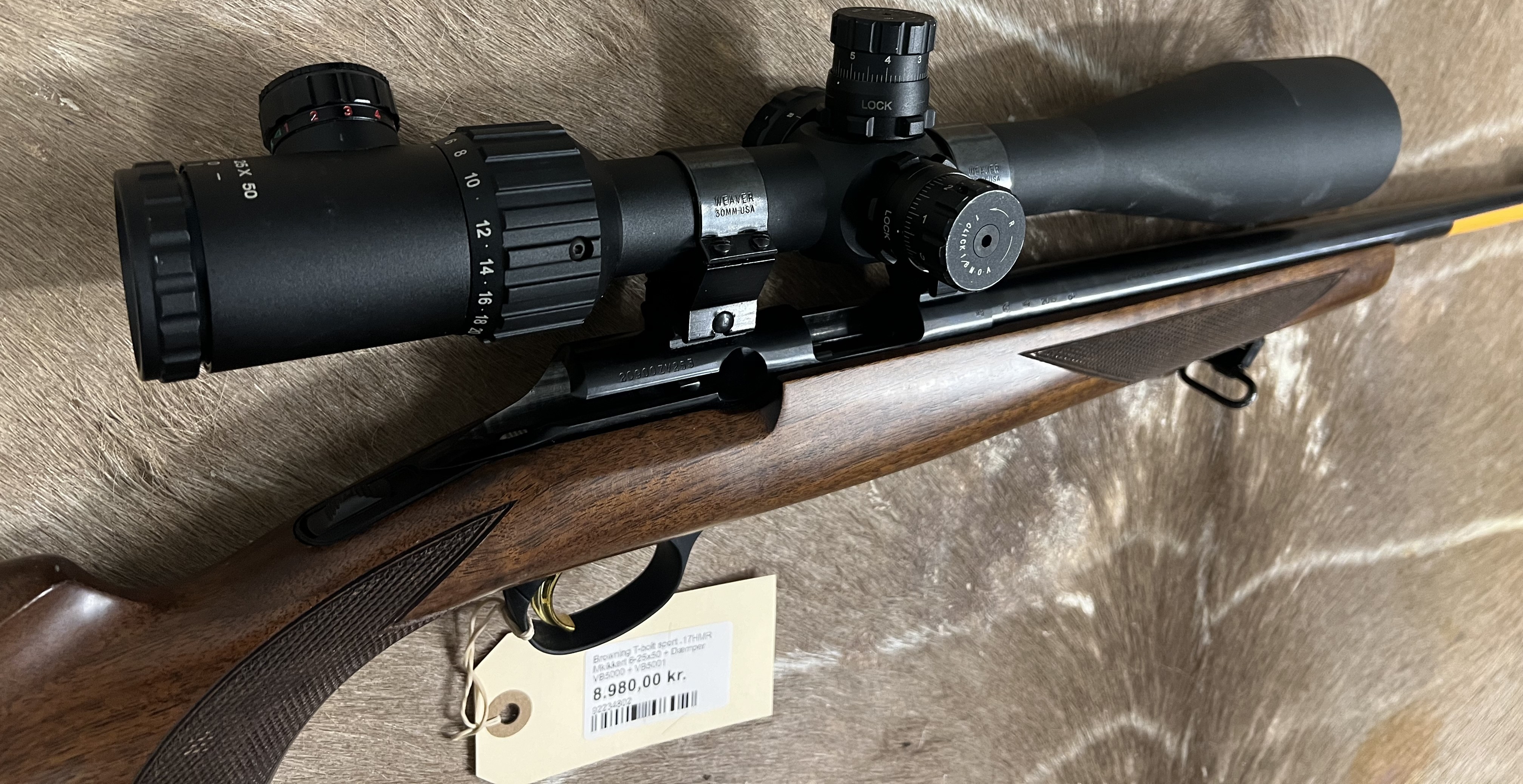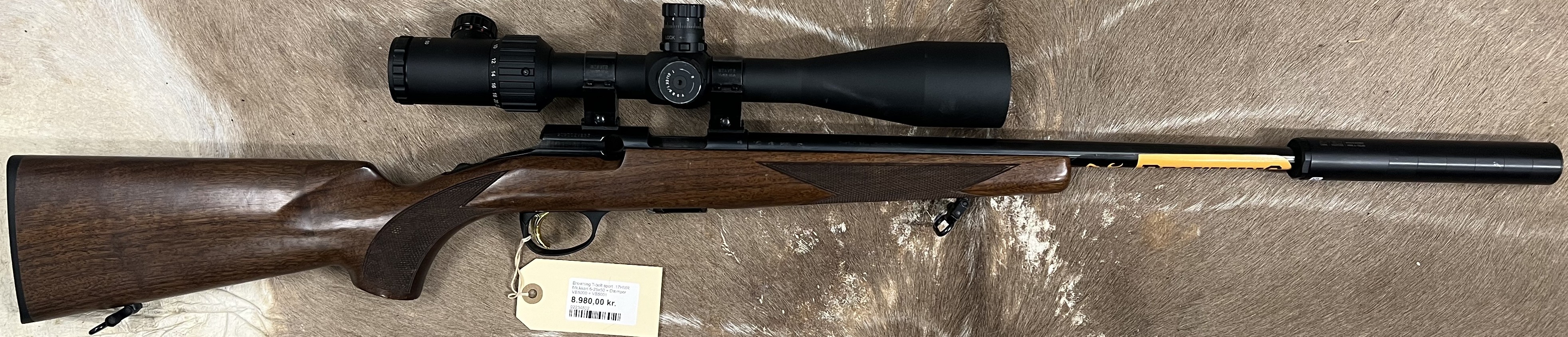 Velholdt og præcis Browning T-Bolt Sport i kaliber .17 HMR – en hurtigskydende og ekstremt fladtskydende salonriffel, perfekt til regulering og småvildt.