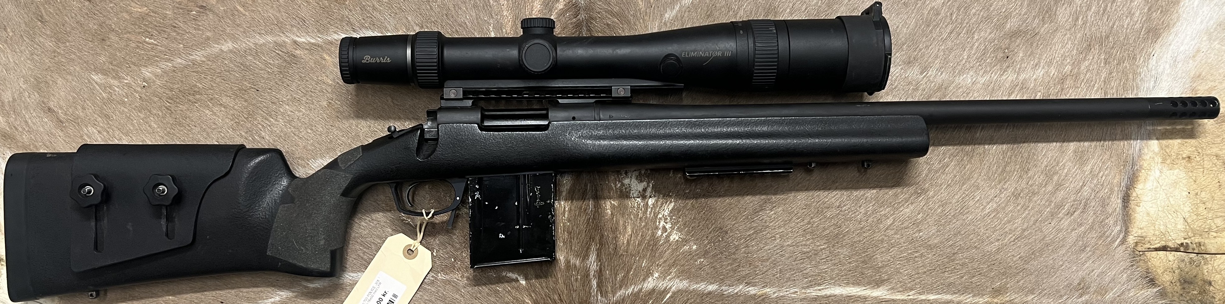 Den pågældende riffel er kamret i .308 Winchester og leveres med Burris 4-16x50 sigtekikkert med indbygget LRF (laser range finder). Riflen fremstår i fin stand og har været anvendt til langdistance skydning.