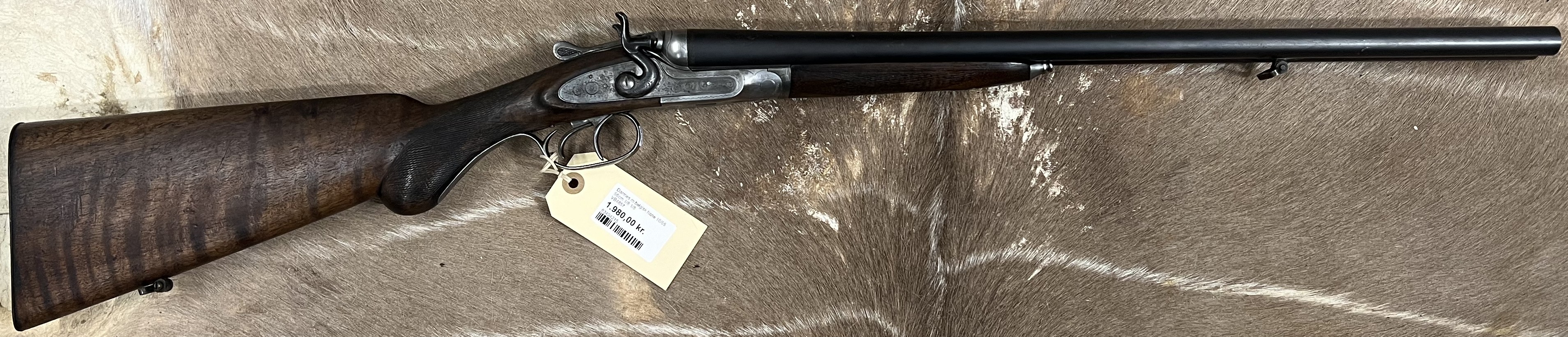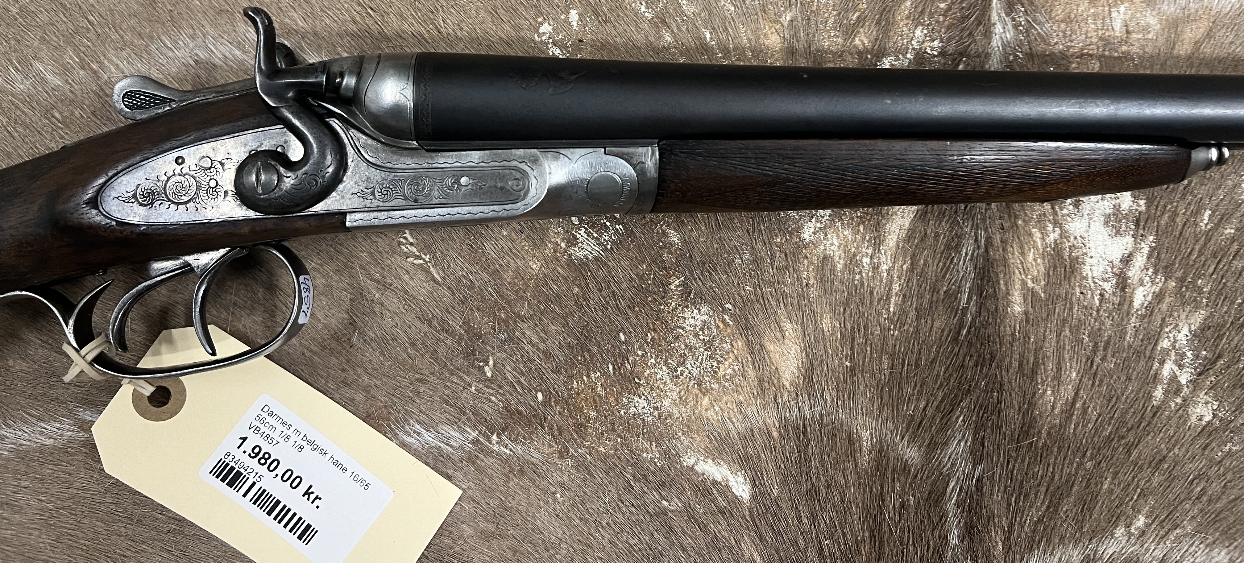 Klassisk og stemningsfuldt belgisk side-by-side hanegevær fra Liège – et stykke ægte jagthistorie. Denne model i kaliber 16/65 er udført med udvendige haner og korte, hurtigtsvingende løb på 56 cm, hvilket gør den særligt velegnet til jagt på kortere hold i tæt terræn.