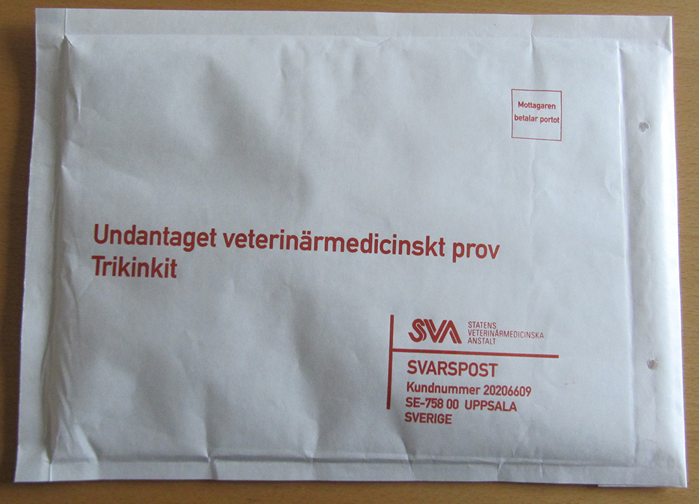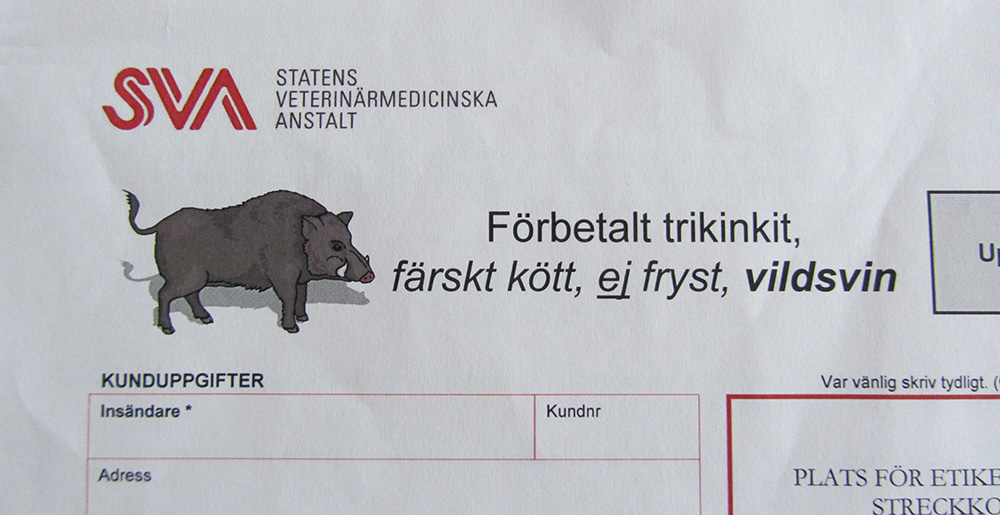 SVA anbefaler at man ikke indsender frossent kød da dette materiale ikke er optimalt at teste på. Hvis det fremsendte kød til test alligevel har været nedfrosset, så indsend dobbelt mængde af det som fremgår af vejledningen. OBS!! Vær opmøærksom på, at hvis man indsender kød, der har været frosset, vil man blive faktureret 169,- SEK fra SVA, da arbejdet med at teste frosset kød er dobbelt så stort som ved ferskt kød.