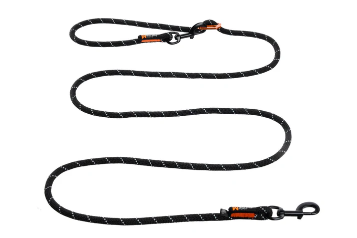 This rope leash is strong and very versatile. At each end there is a swivel eye snap hook. One of the hooks can be attached to your dog, while the other attaches to a lightweight aluminum buckle. This buckle can be easily adjusted, so that the loop and length of the leash fit your needs at any moment. That means the Rock adjustable leash can be worn around your waist for hands-free walking, secured around a tree when camping or looped and used as a regular handle.
