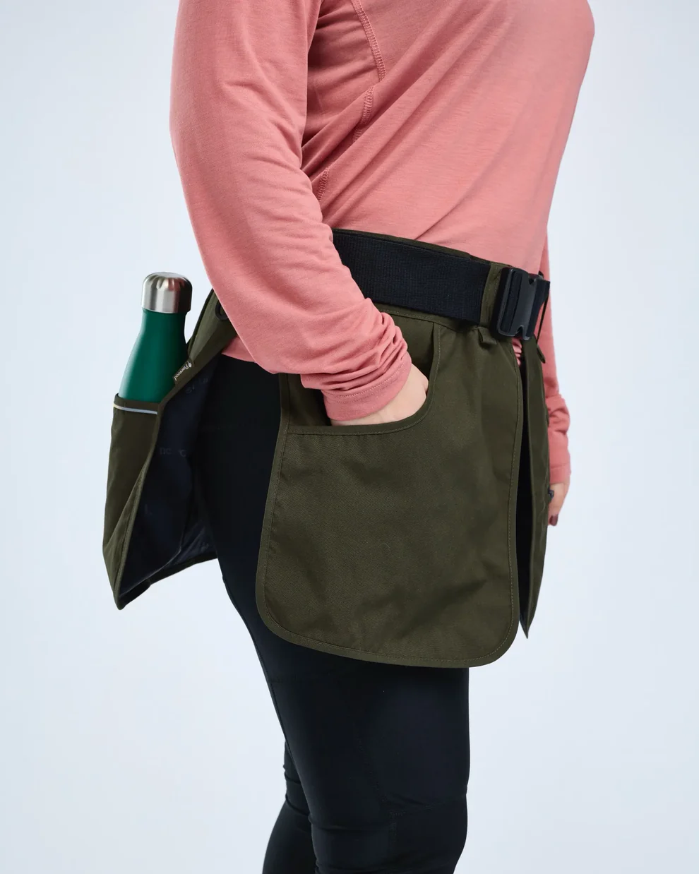 The pockets can be detached from the belt, allowing you to choose which pockets to wear during use. There are two D-rings at the back where you can attach additional equipment. The back pocket features reflective details for extra visibility in the dark, and the left front pocket has a small safety pocket with a zipper for secure storage of keys and similar items.