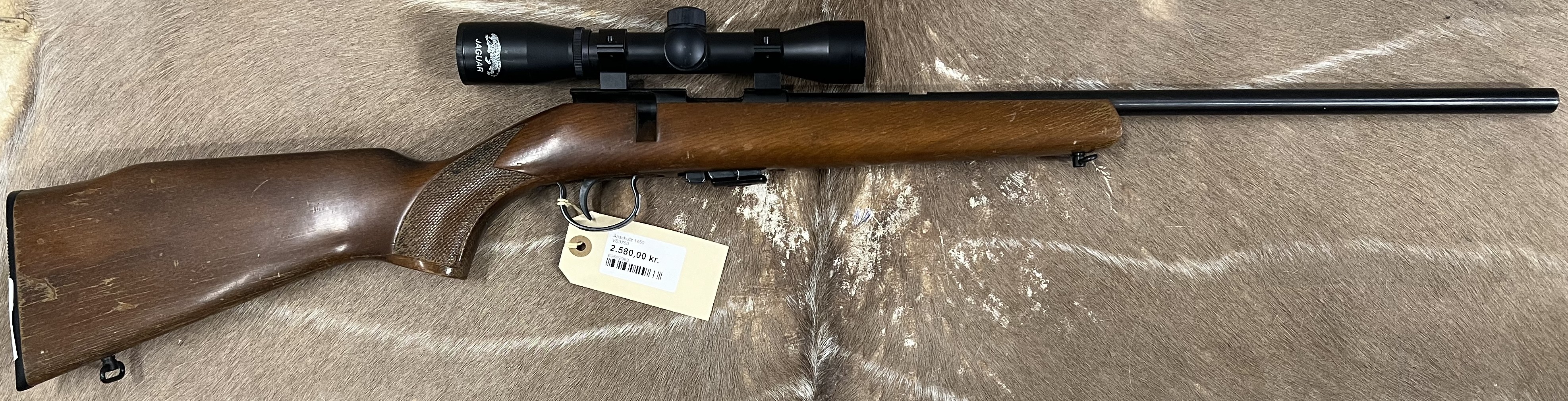 Brugt Anschutz 1450 i kaliber .22LR er en salonriffel med bolt-action system, kendt for sin solide konstruktion og driftssikkerhed. Egnet til træning og småvildt.