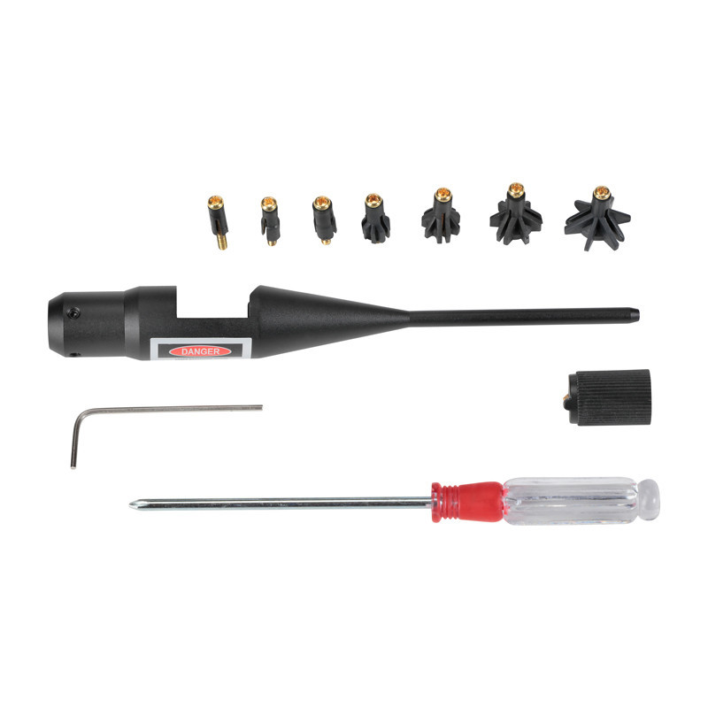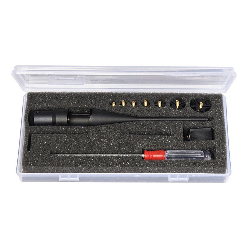Universel laserkollimator til øjeblikkelig sigtejustering. Leveres med 6 adaptere til alle skydevåben fra 4,5 mm til 12,7 mm kaliber. Kollimatoren monteres i skydevåbnets munding. Den projicerer en lysstråle fra løbets midterlinje. Klasse II-laseren er konstrueret af aluminiumslegering og giver dig mulighed for at forudjustere dine sigtemidler og kontrollere justeringen af ​​din optik når som helst og hvor som helst. Batterier medfølger. (Drevet af 3 LR44 knapcellebatterier (eller A76 / AG13)) Længde: 17 cm; Bredde: 8 cm; Dybde: 2,5 cm; Vægt: 0,115 kg