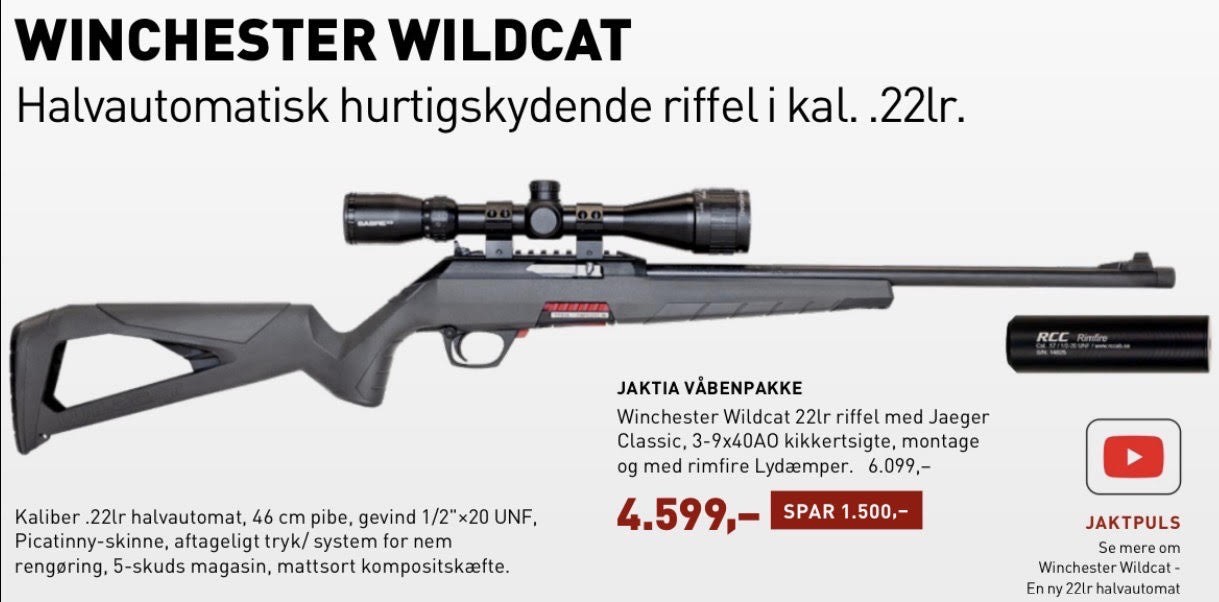 Winchester Wildcat er en halvautomatisk salonriffel i kaliber .22 LR. Her leveret som en komplet Jaktia-pakke med kikkertsigte, montage og lyddæmper.
